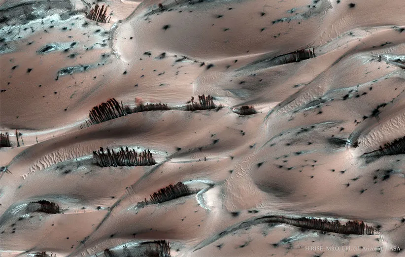 این عکس را مدارگرد MRO در سال ۲۰۰۸ از حوالی قطب شمال مریخ گرفته است. ممکن است فکر کنید قسمتهای تیرهرنگ، درختچههایی روی شنهای سطح مریخ هستند. اما واقعیت این است که نور خورشید در بهار، یخ کربندیاکسیدی سطح مریخ را ذوب کرده و در نتیجه شنهای تیرهرنگ داخل رملهای شنی پیدا شدهاند. وقتی نور خورشید یخهای قسمتهای بالایی رملها را ذوب میکند، شنهای تیرهرنگ از بالا به پایین سرازیر میشوند و از ارتفاع به شکلی دیده میشوند که انگار روی مریخ انبوه درختهایی وجود دارد. عرض این عکس چیزی در حدود یک کیلومتر است و عوارضی به اندازهی ۲۵ سانتیمتر روی آن دیده میشوند. اگر با دقت بیشتر به بعضی قسمتهای عکس نگاه کنید، متوجه سطح مواج شنها میشوید. سطوح مواجی که روان بودن مداوم شنها هستند.