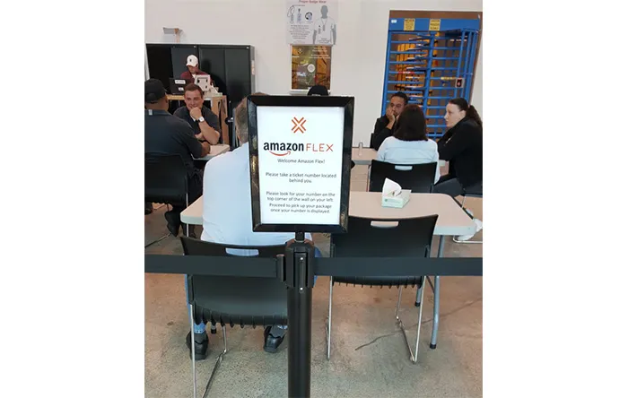 برچسبی روی یکی از دیوارهای شیشهای این دفتر نصب شده. بر روی برچسپ نوشته شده: «به آمازون فلکس خوش آمدید! لطفا داخل شوید و در مسیر خط سبز حرکت کنید.» در داخل ساختمان هم تابلوی راهنمایی وجود دارد. بر روی این تابلو نوشته شده که مراجعان باید با تهیهی بلیت خاص، منتظر بمانند تا نوبتشان برسد. درست مثل این است که شما به بانک یا ادارهی دولتی مراجعه کردهاید و میخواهید با دریافت نوبت، خدماتی را دریافت کنید.