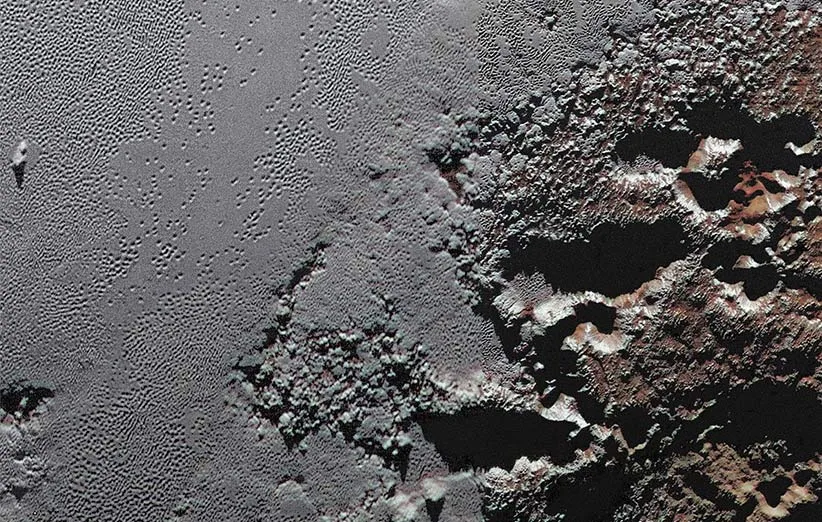 در عکسی که میبینید، یکی از دشتهای پر از چالهی پلوتو به کوهستانی بلند رسیده است. در سمت چپ قسمتهای جنوب-شرقی دشت اسپوتنیک پلانوم قرار دارد. در قسمت سمت راست عکس که سطح تاریکتری هم دارد، کوهستانهای «کرون ماکولا» (Krun Macula) دیده میشود که حدود ۲٫۵ کیلومتر ارتفاع دارند. در مرز این دو منطقه، خوشههای متصل به هم از چالههای بزرگ درههایی عظیم به طول ۴۰ کیلومتر را بوجود آوردهاند. دشتهای روشن سمت چپ دارای یخ نیتروژن هستند و به همین دلیل بازتاب سطحشان زیاد است. ارتفاعات قرمز رنگ سمت راست از ترکیبهای پیچیدهای به نام «تالین» (Tholin) پوشیده شدهاند. این عکس را فضاپیمای افقهای نو به هنگام گذر نزدیک از کنار پلوتو در جولای سال ۲۰۱۵ گرفته است.