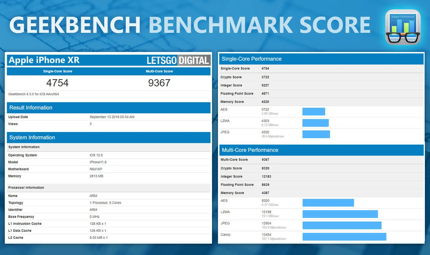 اول از همه به نتایج بنچمارک ارزان‌ترین مدل آیفون یعنی آیفون‌ XR نگاهی می‌اندازیم که قرار است با قیمت پایه 749 دلاری روانه بازار شود. در این بنچمارک، این گوشی در آزمایش تک‌هسته‌ای موفق به اخذ امتیاز عالی 4754 شده و در آزمایش چندهسته‌ای هم امتیاز 9368 را گرفته است. در کنار تراشه A12 این گوشی، 3 گیگابایت حافظه رم تعبیه شده است. باید خاطرنشان کنیم که آیفون 8 پلاس و آیفون X هم از همین مقدار حافظه رم بهره می‌بردند.