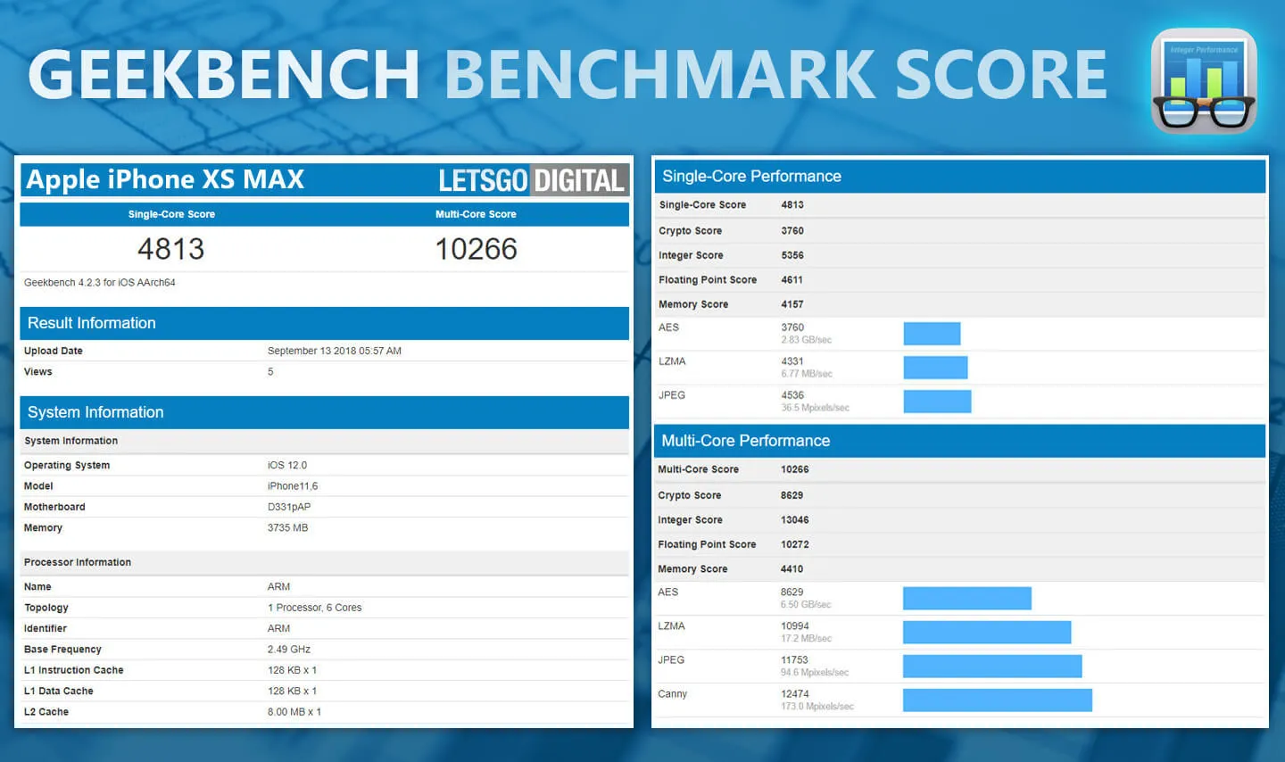 در مورد گران‌ترین مدل یعنی آیفون XS مکس هم نتایج آزمایش تک‌هسته‌ای آن با گرفتن امتیاز 4813 تقریبا مشابه آیفون XR است. البته تفاوت آن‌ها در زمینه‌ی آزمایش چندهسته‌ای حدود 1000 امتیاز است و این گوشی موفق به اخذ امتیاز 10266 شده است. البته برخلاف آیفون‌ XR، گوشی آیفون‌ XS مکس از 4 گیگابایت حافظه رم بهره می‌برد. هرچند هنوز آیفون‌ XS بنچمارک نشده، اما با توجه به اینکه قطعات داخلی این دو گوشی یکسان است، پس می‌توانیم انتظار نتایج بنچمارک یکسانی را داشته باشیم.