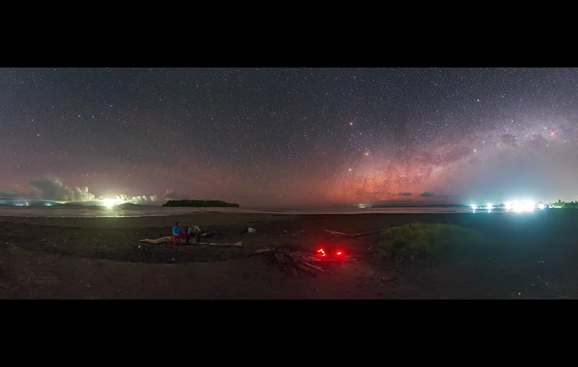 به شب استوایی خوش آمدید. این تصویر پانوراما که از ۲۴ عکس تشکیل شده شب ۴ مارس ۲۰۱۶ در یکی از جزایر اندونزی گرفته شده است. عرض جغرافیایی محل عکاسی ۰٫۷ درجهی شمالی بوده و بنابراین این عکس تقریبا روی خط استوا گرفته شده است. در این تصویر به خوبی میتوان صورتهای فلکی مشهور نیمکرهی شمالی و جنوبی را دید. مثلا صورت فلکی دب اکبر در چپترین قسمت عکس و صورت فلکی صلیب جنوبی در راستترین قسمت عکس قرار گرفتهاند. در بالای قسمت مرکزی راهشیری میتوان سیارههای زحل، مریخ و ستارهی قلبالعقرب را دید. جالب اینجاست که به خوبی میتوان در افق هر دو سوی قطب شمال و قطب جنوب را تشخیص داد.