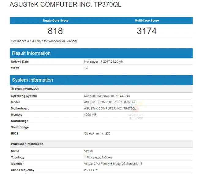 بنچمارک Geekbench این لپتاپ ایسوس منتشر شده است. میتوانیم ببینیم که این کامپیوتر از همان هشت هستهی اسنپدراگون ۸۳۵ و چهار گیگابایت حافظهی رم استفاده میکند. انتظار داریم لپتاپهایی که این پردازنده را دارند، حداقل میزان حافظهی رم را به هشت گیگابایت برسانند.