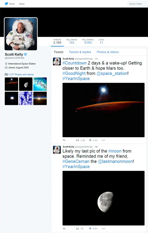 اسکات کلی به جز انجام شغلش، از درون پنجرهی ایستگاه فضایی عکسهای خیلی زیبایی از زمین گرفته و برای ما فرستاده است. خوشبختانه اینترنت پرسرعت در ایستگاه فضایی برقرار است و اسکات به طور متوسط روزی بیشتر از دو عکس بر روی اینستاگرامش به اشتراک گذاشته است. در توییتر هم وضعیت به همین گونه بوده و اسکات با بیش از ۲۰۰۰ توییت در این مدت، با ۹۰۰ هزار فالوئرش در تماس بوده است. اسکات کلی به طور کلی حدود ۷۱۳ عکس از فضا برای ما فرستاده است. در ادامه میتوانید بعضی از عکسهای سفر یک سالهی کلی را ببینید.