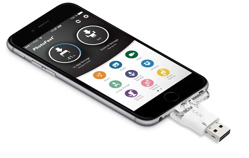 حالا اگر شما آیفون ۱۶ گیگابایتی دارید یا می‌خواهید این مدل را تهیه کنید، بد نیست بدانید که شرکتی به نام «فوتوفست» PhotoFast اخیرا نسل دوم یک ابزار جانبی برای آیفون به نام «مکس اکستریم» Max Extreme را معرفی کرده است. همان‌طور که در تصویر می‌بینید، مکس اکستریم یک درایو کوچک فلش است که از طریق درگاه Lightning به دستگاه iOS شما متصل می‌شود.