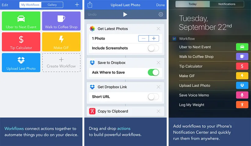 اپلیکیشن Workflow برای این طراحی شده که با به هم بستن چند وظیفهی مختلف و ترکیب کردن آنها در قالب یک عملکرد واحد در وقت شما صرفهجویی کند. با این اپلیکیشن آیفون میتوانید کارهایی چندمرحلهای را (نظیر تماس با یک فرد خاص، یا توییت کردن آهنگی که گوش میدهید) به عملکردهایی خودکار تبدیل کنید. سپس میتوانید آن عملکرد را برای دسترسی سریعتر بهعنوان یک اپلیکیشن مجزا روی صفحهی هوم قرار دهید یا آن را به صفحهی لاکاسکرین آیفون بیفزایید.