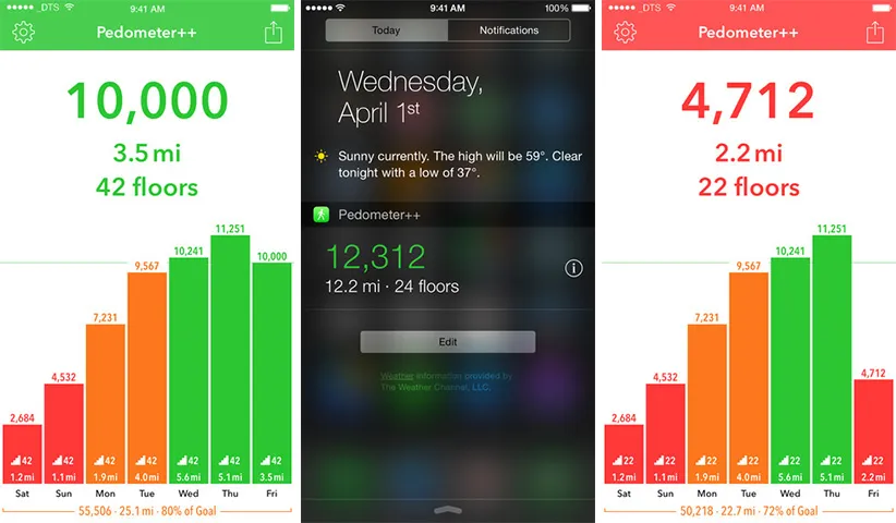 اپلیکیشن ++Pedometer ابزاری عالی است که اجازه میدهد پیشرفت خود را در زمینهی فعالیتهای روزانه و اهداف تناسب اندامی که تعریف کردهاید در یک نگاه سریع بازبینی کنید. این اپلیکیشن آیفون دو راه سریع برای بازبینی پیشرفت روزانه در اختیارتان قرار میدهد. میتوانید از ویجت ++Pedometer در نوتیفیکشن سنتر آیفون استفاده کنید یا به اعلان قرمز کوچک روی آیکن اپلیکیشن سر بزنید که تعداد قدمهای روزانهای را که تا آن لحظه برداشتهاید نشان میدهد.