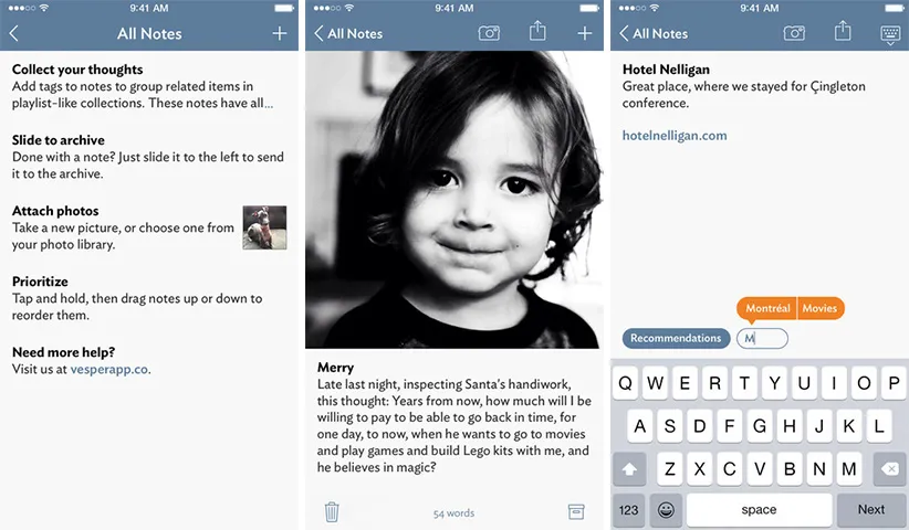 Vesper یک اپلیکیشن یادداشتبرداری است که کار شما را برای مدیریت کردن و نظم بخشیدن به اندیشههایتان آسان میکند. میتوانید بهراحتی هر نوشتهی جدید را با تگهایی لیبلگذاری کنید تا در آینده با یک جستجوی ساده به تمام ایدههایی که در مورد یک موضوع خاص ثبت کردهاید دسترسی داشته باشید. همچنین تمام یادداشتهای شما بهطور خودکار با یک اکانت Vesper سینک خواهند شد.
