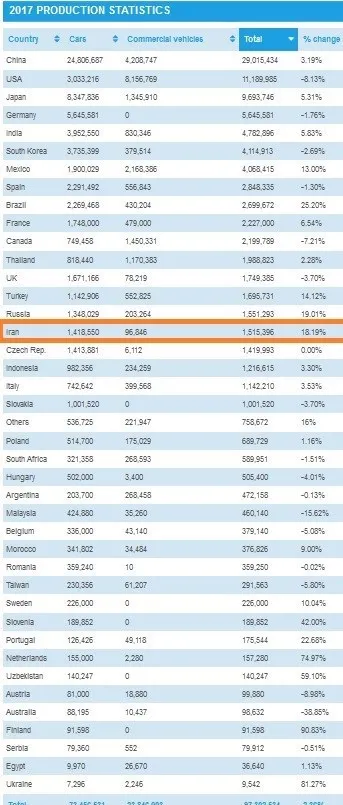 سازمان بینالمللی تولیدکنندگان وسایل نقلیه موتوری (Organisation Internationale des Constructeurs d’Automobiles) لیستی از کشورهای مختلف جهانی منتشر کرده که بر حسب تیراژ تولید خودرو در سال 2017 طبقه بندی شده اند. در جایگاه شانزدهم این لیست نام ایران به چشم می خورد که در سال میلادی گذشته توانسته با رشد 18 درصدی از مرز تولید 1.5 میلیون دستگاه عبور کند.