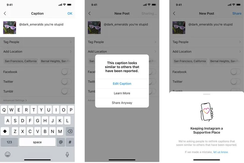 روز گذشته اینستاگرام اعلام کرد که اگر کاربران برای «کپشن» (caption) عکس یا ویدیو متن توهینآمیزی بنویسند، قبل از انتشار از جانب اینستاگرام هشداری دریافت میکنند. اینستاگرام برای این کار از هوش مصنوعی استفاده میکند و با مقایسه متن نوشته شده با کپشنهای مربوط به پستهای گزارش داده شده، میتواند این موضوع را تشخیص بدهد. در ادامه، اینستاگرام کاربران مذکور را تشویق کنند که تغییراتی بر کپشن موردنظر اعمال کنند ولی این افراد این حق انتخاب را هم دارند که بدون اعمال هیچ تغییری پست را منتشر کنند.