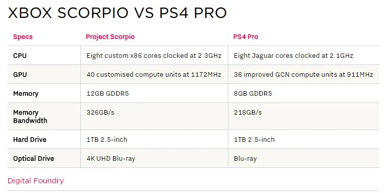 جدول مقایسه ایکسباکس اسکورپیو با پلیاستیشن ۴ پرو