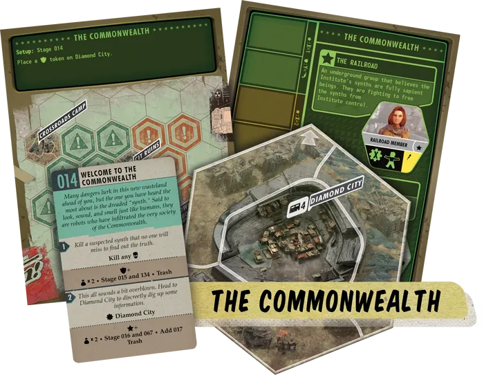 چهار سناریو اصلی در بازی تختهای فالآوت وجود دارد: The Pitt، The Commonwealth، For Harbor و The Capital Wasteland. دو سناریو از فالآوت 3 و دو سناریو از فالآوت 4 برداشته شدهاند. بقیهی قسمتهای نقشه میتوانند هر چیزی را در خودشان جای دهند و محدود به سناریوها نیستند.
