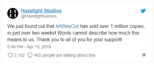 استودیوی بازیسازی Hazelight که پیش از این بازی Brothers: A Tale of Two Sons را ساخته بود، این خبر را در حساب کاربری توییتر خود منتشر کرده است. این استودیو نوشته است که تنها در دو هفته، بازی A Way Out توانسته است بیش از یک میلیون نسخه فروش داشته باشد.