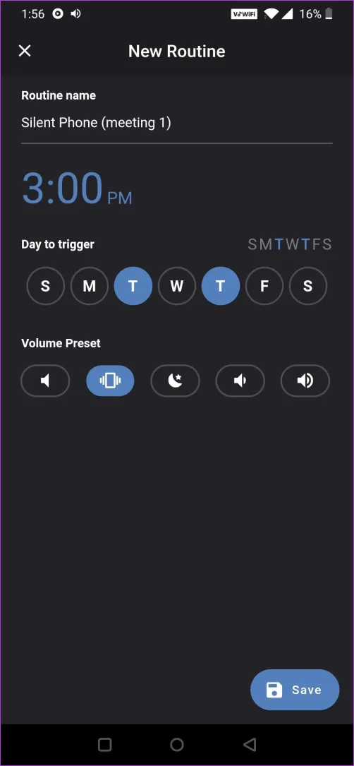 از قابلیتهای جالب این برنامه میتوان به برنامه ریزی برای فعال کردن حالت سکوت اشاره کرد. مثلا برای اینکه ساعت سه عصر هر روز، گوشی روی حالت سکوت برود یا برای یک رویداد، صدا روی حالت خاصی تنظیم شود، فقط کافیست گزینه Routines را انتخاب کرده، سپس رویداد مورد نظر، زمان و میزان صدای مورد نظر را برای آن فعال کرد! یکی از مزیتهای این برنامه این است که میتوانید چندین پروفایل مختلف را همزمان اجرا کنید!