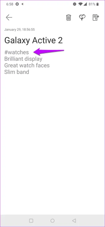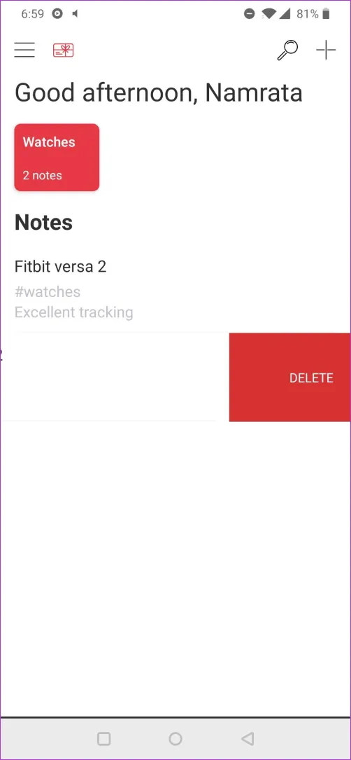 جستوجو در میان نوشتهها و پوشهها در این برنامه نیز بسیار ساده است. فقط کافی است کلمه کلیدی مرتبط با نوشته خود را جست و جو کنید تا پوشه مورد نظر پیدا شود. مهم نیست کلمه کلیدی مربوط به عنوان نوشته یا قسمتهای مختلف از میان متن باشد، قدرت سرچ این برنامه به قدری بالا هست که بتواند به راحتی فایل مورد نظر شما را پیدا کند. برای پاک کردن یک نوشته هم تنها کافی است به چپ سوایپ کنید!