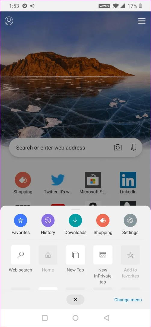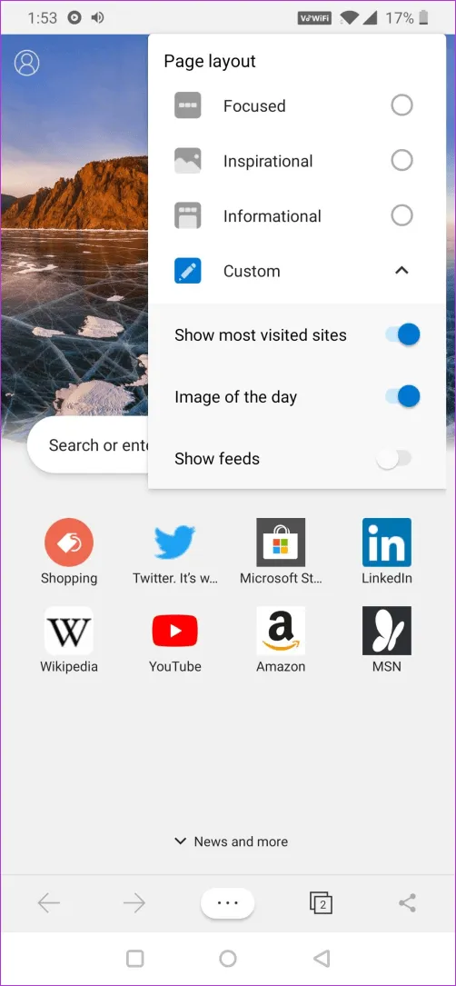 علاوه بر این، در قسمت بالا و راست این مرورگر یک منو همبرگری جدید تعبیه شده که گزینههای مختلفی جهت شخصیسازی در اختیار کاربر قرار میدهد. 4 حالتی که از بین آنها میتوانید انتخاب کنید حالتهای Focused، Inspirational، Informational و Custom هستند. در حالت پیش فرض یعنی Focused، سادهترین شکل ممکن را خواهید داشت به همراه نوار جستوجو و صفحاتی که اخیرا مشاهده کردید. حالت Inspirational، امکان پشتیبانی از تصاویر زمینه Bing را فراهم میکند.