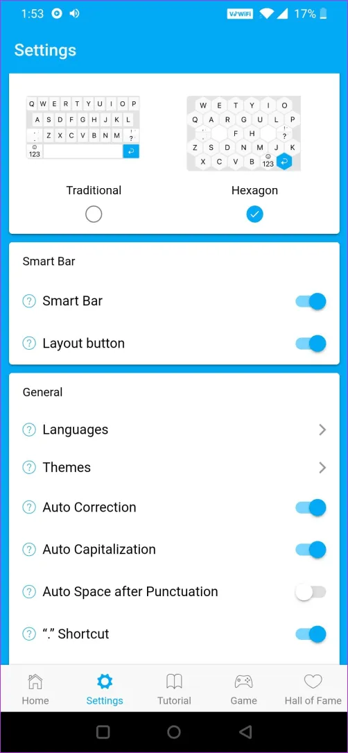 تایپ کردن با این صفحه کلید شاید اوایل کمی سخت بنظر بیاید ولی وقتی که به تایپ کردن به آن عادت کنید، سخت است بتوانید از صفحه کلید دیگری استفاده کنید! شکل و شمایل این برنامه از طرح و چیدمان QWERTY سنتی خارج شده و همانطور که در تصویر زیر میبینید، کلیدها قالبی چند ضلعی و جالب دارند.