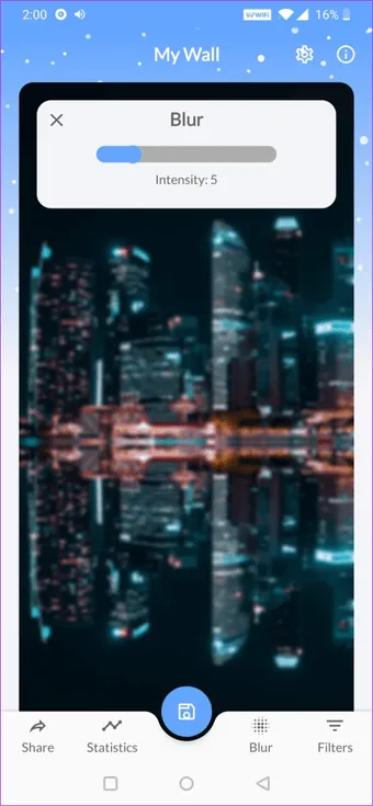 My Wall برنامهای فوق العاده برای شخصی سازی تصاویر پس زمینه گوشیهای هوشمند است. این برنامه حجم کمی داشته و به کاربر اجازه میدهد تغییر دلخواه خود را روی تصاویر زمینه گوشی اعمال کند. به عنوان مثال، اگر میخواهید درخشندگی تصویر را تغییر دهید میتوانید پس زمینه را تار کرده و یا فیلترهایی را جهت انجام تغییرات مورد استفاده قرار دهید.