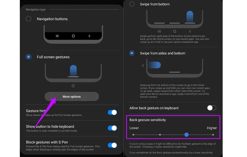 برای دسترسی به تنظیمات مربوط به ژست‌های ناوبری ابتدا وارد تنظیمات گوشی شده و در قسمت نمایشگر (Display)،‌ گزینه نوار ناوبری (Navigation bar) و سپس بیشتر (More) را لمس کنید. سپس می‌توانید با کشیدن دایره آبی رنگ از چپ به راست و برعکس، حساسیت را زیاد و یا کم کنید.