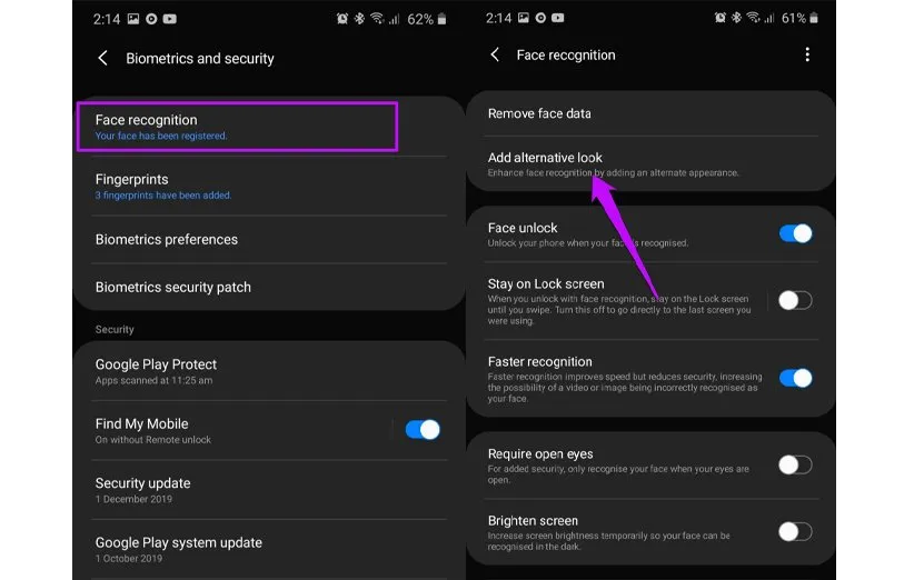 برای فعال کردن این قابلیت ابتدا به تنظیمات رفته و در قسمت جستجو، عبارت تشخیص چهره (Face Recognition) را سرچ کنید. بعد از ورود به این بخش، گزینه Add alternative look در همان بالای تصویر ظاهر خواهد شد. آن را لمس کرده و باقی کارها را دقیقا مانند ثبت اولین تصویر خود انجام دهید.
