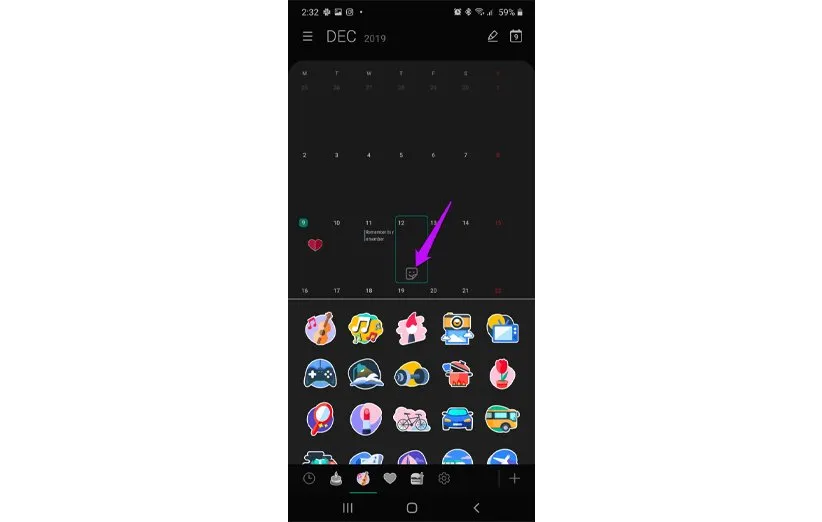 مثلا اگر بخواهید برای سر رسید قسط خود، زمانی را مشخص کنید، می‌توانید استیکری را روی آن تاریخ اضافه کنید. هنگامی هم که تاریخ مورد نظر فرا رسید، یادآور با نمایش استیکر، به صدا در خواهد آمد. برای انجام این کار، برنامه تقویم (Calendar) را باز کرده، آیکون اموجی زیر هر تاریخ انتخاب شده نمایان می‌شود. روی آن کلیک کرده و اموجی را انتخاب کنید که به بهترین شکل، شرایط تاریخ شما را توصیف می‌کند.