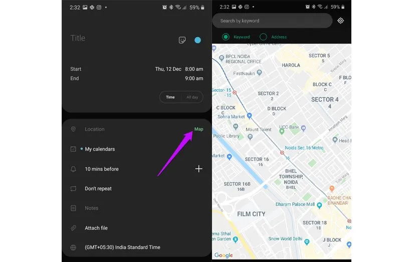 در ادامه بحث‌ یادآور، باید این نکته را نیز اشاره کنیم که می‌توانید بر اساس یک منطقه، یادآوری را برای زمان مشخص تنظیم کنید. همچنین می‌توانید این یادآور را با خانواده و دوستان خود به اشتراک بگذارید. برای انجام این کار، رویدادی را باز کنید و روی گزینه Map کلیک کنید. منطقه مورد نظر خود را وارد کنید (منطقه‌ای که می‌خواهید یادآور در آن‌ محل به صدا در بیاید) و سپس آن را ذخیره کنید.