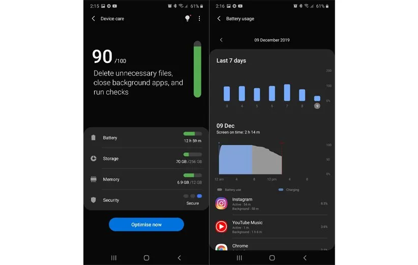 از دیگر بخش‌هایی که در رابط کاربری One UI 2.0 تغییر کرد، بخش سلامت دستگاه بوده که تحت عنوان Device Care شناخته می‌شود. بخش‌هایی از این برنامه دستخوش تغییراتی ظاهری شده تا کاربر بعد از ورود به آن، اطلاعات بیشتری دریافت کند. برای مثال اگر بخش باتری را باز کنید، نموداری را مشاهده می‌کنید که مصرف باتری شما را در محدوده زمانی خاصی نشان می‌دهد. مثل همیشه، نام برنامه‌هایی هم که بیشترین مصرف را داشته‌اند در پایین صفحه به نمایش در خواهد آمد.