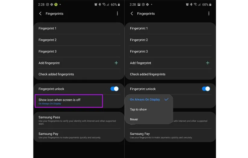 از دیگر قابلیت‌های جالب One UI 2.0، امکان شخصی‌سازی آیکون اثر انگشت روی صفحه است. به این صورت که می‌توانید انتخاب کنید هنگامی که صفحه گوشی خاموش است، آیکون اثر انگشت روی صفحه نمایان شود یا خیر. همینطور می‌توانید انتخاب کنید فقط اگر گوشی روی حالت نمایشگر همیشه روشن (Always On Display) قرار داشته باشد،‌ آیکون اثر انگشت به نمایش درآید.