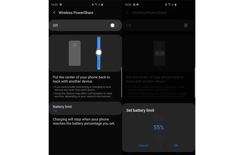 نکته: قابلیت جدیدی تحت عنوان Battery Limit نیز در این رابط کاربری در اختیار کاربران قرار دارد. قابلیتی که اجازه نمی‌دهد هنگام شارژ ساعت هوشمند،‌ شارژ خود گوشی کاملا تخلیه شود. برای دسترسی به این بخش باید ابتدا وارد بخش باتری شده و عبارت Wireless PowerShare را انتخاب کنید.