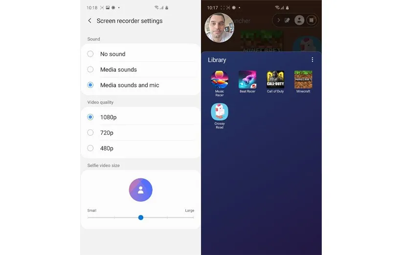 یکی از قابلیت‌های جذابی که به همراه One UI 2.0 به گوشی‌های گلکسی S10 اضافه شده، امکان ضبط رویداد صفحه با کیفیت 480، 720 و 1080p است. همچنین می‌توانید با استفاده از دوربین سلفی که به صورت دایره کوچکی در گوشه‌ای از صفحه ظاهر می‌شود، همزمان با ضبط صفحه، ویدئو‌های سلفی بگیرید.