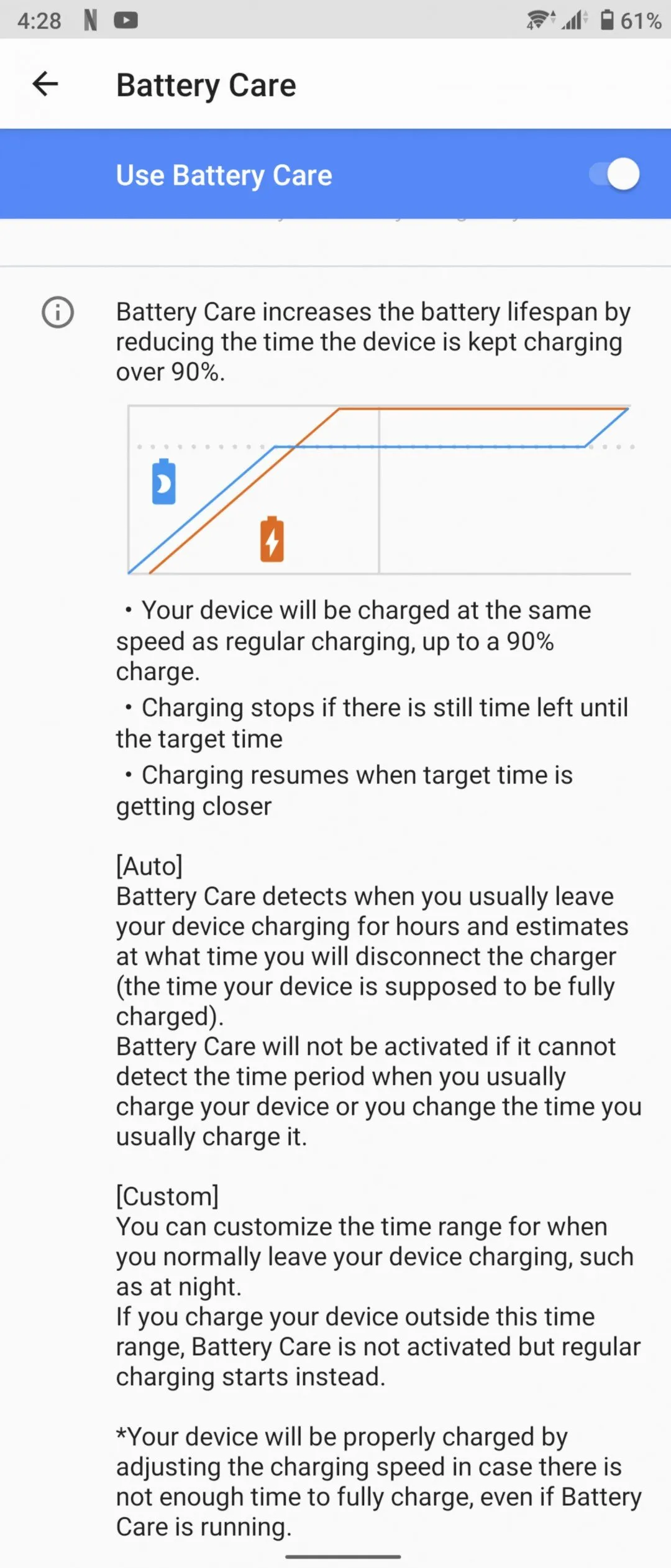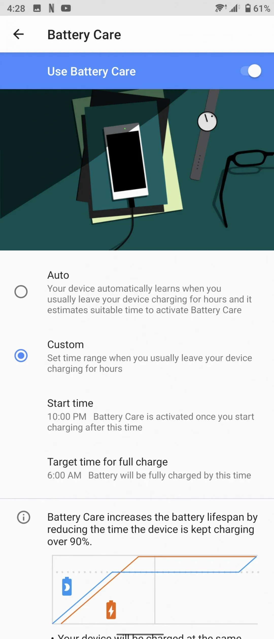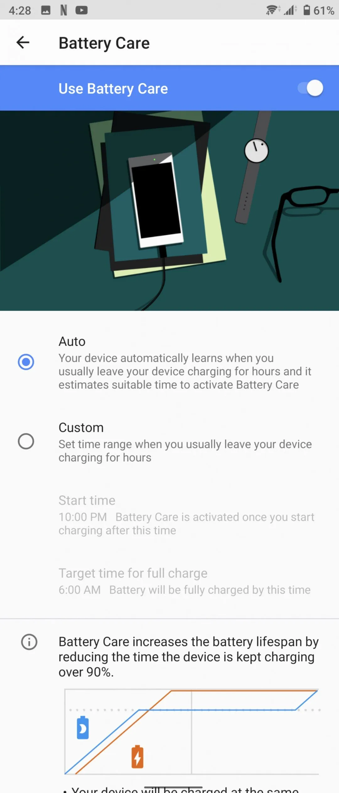 طبق معمول، قابلیت Battery Care در این گوشی نیز وجود دارد که عملکردی مشابه با Battery Optimizer داشته و سرعت شارژ شدن را از 90 درصد به بالا کاهش میدهد. سپس با فراگیری عادت شارژ گوشی توسط کاربر، چند دقیقه قبل از اینکه گوشی را از شارژر جدا کنید، شارژ گوشی را به 100 میرساند.