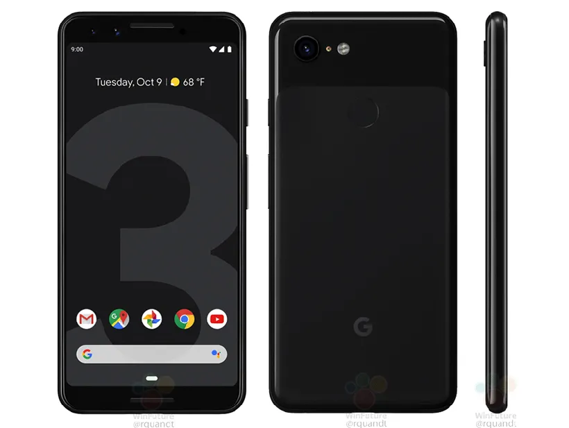 دیگر شمارش دفعاتی که خبر و عکسی از این گوشیها لو رفته، از دستمان در رفته است. شاید جالبترین نوع این لو رفتنها به زمانی برگردد که یک بار پیکسل 3 اکسال پشت یک تاکسی جا گذاشته شد و راننده آنرا پیدا کرد و به جمع لو دهندگان اطلاعات پیکسل 3 پیوست. در رندرهایی که در ادامه مشاهده خواهید کرد، بخش جلویی و پشت پشتی دستگاه همراه با بخش سمت چپ گوشی به خوبی دیده میشود. در بخش جلویی همانطور که انتظار داشتیم در نسخه بزرگتر یک بریدگی واقعا نامناسب در بالای نمایشگر قرار گرفته که در آن دو دوربین و یک بلندگو که هم برای تماس و هم برای پخش صدا به صورت استریو استفاده میشود، قرار گرفته است. در لبه پایینی دستگاه که اتفاقا آن بخش نیز باریک نخواهد بود، بلندگوی اصلی دستگاه قرار گرفته است. نسخه معمولی پیکسل نیز قید بریدگی نمایشگر را زده و تمام این بخشهای سختافزاری را در طراحی مشابه پیکسل 2 قرار داده است.