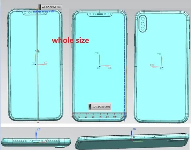 از سوی دیگر تصاویر شماتیک جدید نشان میدهند که صفحهی ۶.۵ اینچی آیفون جدید در یک بدنهی ۶.۱۸×۳.۰۳ اینچی جا گرفته که در صورت صحت این موضوع باید گفت با وجود صفحهی بزرگتر، در مجموع با موبایلی کوچکتر از آیفون ۸ پلاس ۵.۵ اینچی طرف خواهیم بود. پیش از این هم رندرهایی از گوشی ۶.۵ اینچی جدید اپل منتشر شده بود که تصاویر شماتیک جدید آن را تایید میکند.