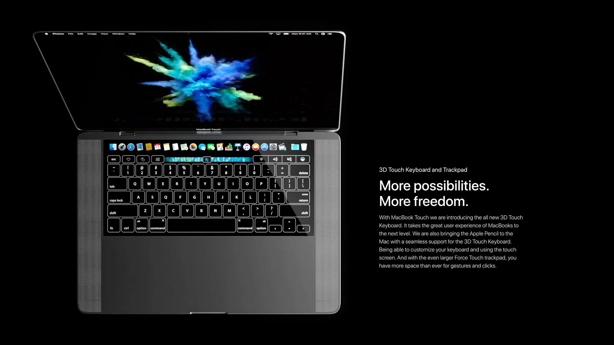 فیل شیلر مدیر ارشد بخش بازاریابی جهانی اپل پیش از این اعلام کرده بود که این شرکت مکبوک پرو یا هیچ نوتبوک دیگری با صفحه لمسی عرضه نمیکند. البته اپل در مکبوک پرو از تاچبار استفاده کرده بود اما این قابلیت باعث نمیشود که این محصول در رده محصولات با صفحهنمایش لمسی قرار بگیرد. اما یک کانسپت جدید از مکبوک منتشر شده که نشان میدهد این محصول قرار است در کیبورد و صفحهنمایش بخشهایی لمسی داشته باشد.