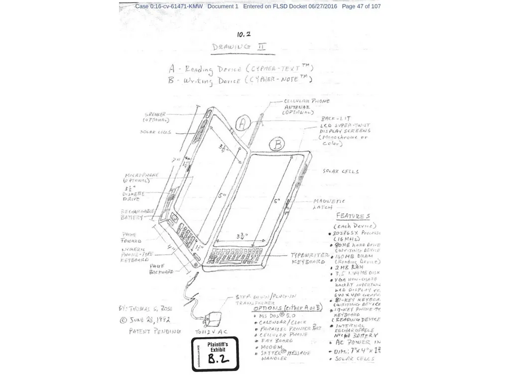 راس در سال ۲۰۱۴ برای پتنتهای خود در ادارهی کپیرایت آمریکا تشکیل پرونده داده و همچنان که در تصاویر نسخهی دستنویس این پتنتها میبینیم، بهجز طرح دارای یک صفحهنمایش، نسخهی دیگری را هم با دو نمایشگر در میان طرحهایش ارایه داده است.