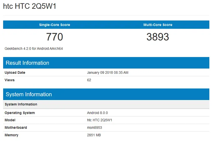 به نظر میرسد که شرکت اچتیسی در حال ساخت یک گوشی میانرده جدید است که به اندروید 8 مجهز شده و با شماره مدل 2Q5W1 شناخته میشود.