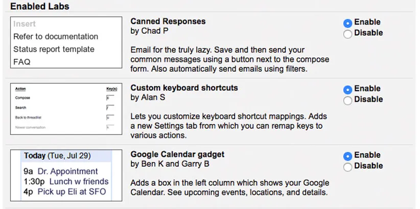 برای فعال کردن Labs، وارد اکانت جیمیل خود شوید و با کلیک روی آیکون چرخدنده که در زیر عکس پروفایل وجود دارد، به بخش «تنظیمات» (Setting) بروید. در قسمت فوقانی این بخش، میتوانید روی عبارت Labs کلیک کنید. بعد از ورود به این بخش، میتوانید انواع و اقسام مشخصهها را مشاهده کنید که در کنار آن توضیح مختصری هم نوشته شده است. اگر مشخصهای مورد پسند شما واقع شد، روی گزینهی Enable موجود در کنار آن کلیک و سپس گزینهی Save Changes را انتخاب کنید. به همین سادگی.