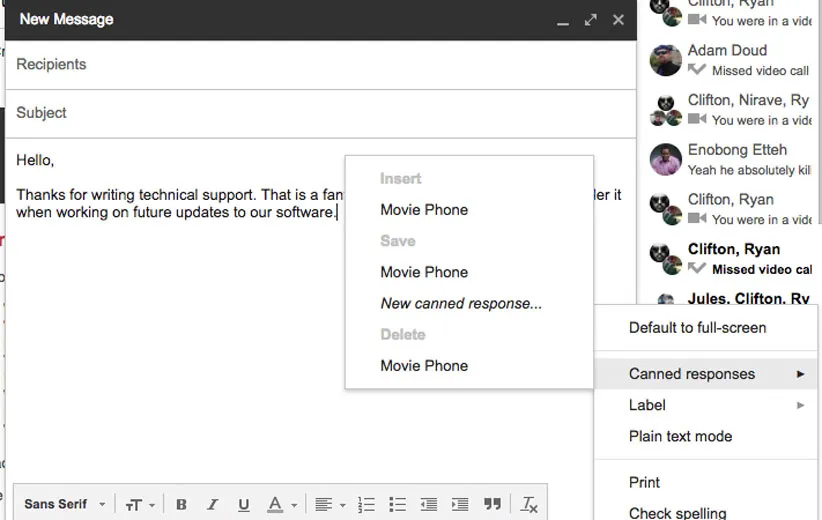بعد از فعال کردن این مشخصه، میتوانید پاسخهای از پیش آمادهشده را ایجاد کنید. ابتدا پیام مورد نظرتان را در صفحهی Compose بنویسید و سپس روی فلش موجود در گوشهی راست پایین صفحهی Compose کلیک کنید. بعد از انتخاب گزینهی Canned responses، میتوانید همین متن تایپشده را بهعنوان یک پاسخ آمادهی جدید ذخیره کنید، این متن را جایگزین یک متن قدیمی کنید یا متن از پیش تایپشده را در ایمیل مذکور درج کنید.