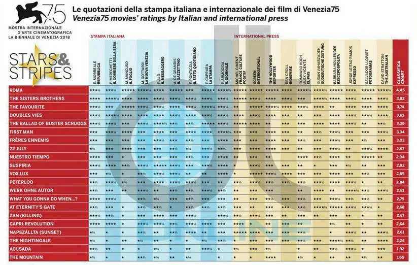 اختتامیه جشنواره فیلم ونیز شب هفدهم شهریورماه برگزار می‌شود و برندگان شیر طلا مشخص خواهند شد. فیلم‌ها همگی به نمایش درآمده‌اند و امسال جشنواره فیلم ونیز شاهد یکی از پرستاره‌ترین دوره‌های خودش بوده است. منتقدان مثل هر سال در جشنواره جدولی برای امتیاز دادن به فیلم‌ها داشته‌اند که مبنای آن پنج ستاره بوده؛ پنج ستاره به معنای عالی، چهار ستاره بسیار خوب، سه ستاره خوب، دو ستاره متوسط، یک ستاره ضعیف و دایره سیاه بی‌ارزش است. نکته جالب اینجاست که در جدول منتقدان امسال فقط دو فیلم امتیاز کمتر از متوسط دریافت کرده‌اند و هیچ فیلمی بی‌ارزش ارزیابی نشده است.