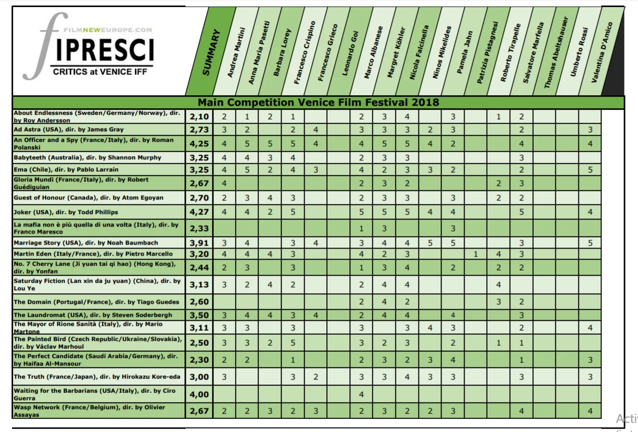 در ادامه میتوانید جدول امتیازات منتقدان اروپایی به فیلمهای جشنواره ونیز 2019 را بررسی کنید: