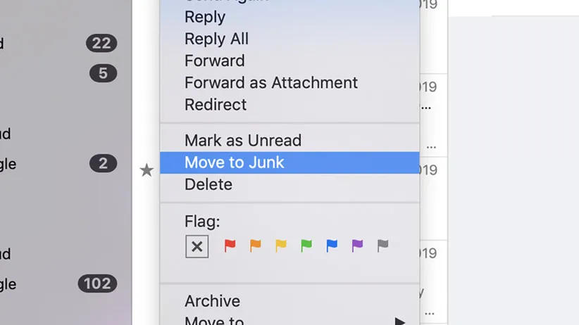 کاربران Apple Mail در macOS میتوانند از گزینه Move selected messages to junk بهره ببرند تا موارد موردنظر آنها روانهی بخش اسپم شود. در پوشه Junk هم برای اصلاح ایمیلهایی که به اشتباه وارد این بخش شدهاند، میتوانید از گزینه Move selected messages to Inbox استفاده کنید. در iOS ابتدا بر آیکون پرچم در سمت چپ بخش پایینی ضربه بزنید و سپس با توجه به مکان ذخیره ایمیل، یکی از گزینههای Move to Junk یا Mark as Not Junk را انتخاب کنید.
