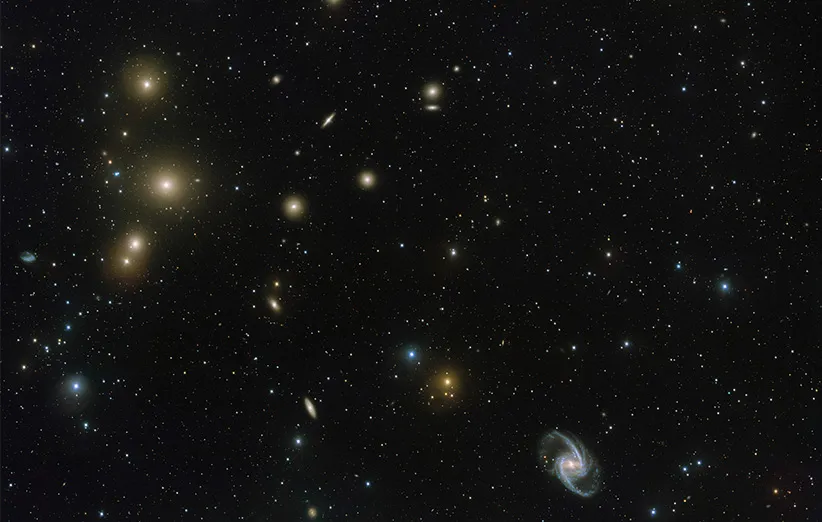 خوشهی کهکشانی «کوره» از روی صورت فلکی کوره نامگذاری شده است. همان صورت فلکی که عمدهی کهکشانهای این خوشه در آن قرار دارند. خوشهی کهکشانی کوره یکی از نزدیکترین خوشههای کهکشانی به راهشیری است. این خوشه ۶۲ میلیون سال نوری با ما فاصله دارد و فقط ۱۰ درصد از خوشهی کهکشانی مشهور سنبله دورتر است. فاصلهی آن ۲۰ برابر فاصلهی بین راهشیری تا کهکشان اندرومدا است. تقریبا هر لکهی زرد رنگی که در این عکس میبینید یکی از کهکشانهای خوشهی کوره است. با این حال زیباترین آنها کهکشان NGC 1365 است که در پایین سمت راست عکس دیده میشود. این عکس فوقالعاده با تلسکوپ VLT متعلق به رصدخانهی جنوبی اروپا در پارانال گرفته شده است.