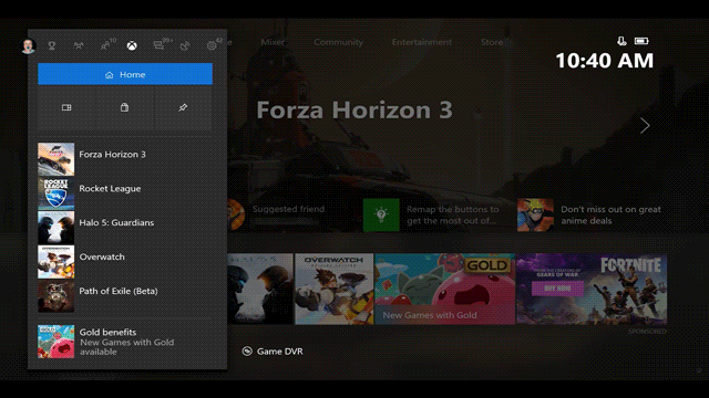 قسمت Guide که با فشار دادن دکمه ایکس بزرگ کنترلر ایکسباکس وان نمایان میشد در آپدیت جدید تغییر کرده است. در این قسمت منوها به صورت افقی قرار گرفتهاند و دیگر در زیر هم قرار ندارند. کاربران با حرکت آنالوگ و یا دکمههای جهت میتوانند به منوهای مختلف قسمت Guide بروند.