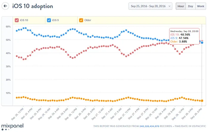 تقریبا پنجاه درصد کاربران آیفون، آیپد و آیپادتاچ که میتوانند از iOS 10 استفاده کنند، در حال حاضر این نسخهی جدید را روی دستگاه خود دارند. iOS 10 همین دو هفته پیش عرضه شد و همراه با خود تعداد زیادی قابلیتهای جدید عرضه کرد. احتمالا به همین خاطر است که آمارهای جدید نشان میدهند ۴۸.5۶ درصد از کاربران دارای دستگاههای سازگار با iOS 10 در حال حاضر از همین نسخه استفاده میکنند.