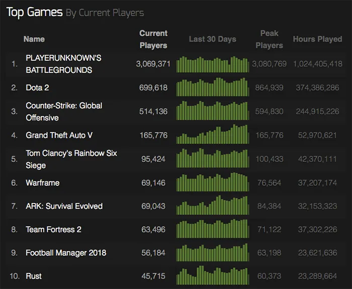 بزرگترین بازی کامپیوتر امسال بدون شک Playeruknown’s Battlegrounds یا همان PUBG است. این بازی توانست حتی زمانی که نسخهی کامل آن عرضه نشده بود و در حالت آزمایشی قرار داشت، تمام بازیهای شرکت والو را در استیم کنار بزند و محبوبترین بازی این پلتفرم شود. رکورد تعداد بازیکنندههای همزمان استیم دوباره به دست PUBG شکسته شده است. دیروز بیش از سه میلیون نفر به صورت همزمان مشغول PUBG بازی کردن بودند.