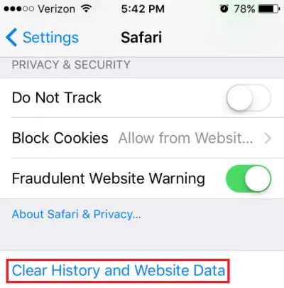 راه دیگر بهینهسازی حافظه این است که به تنظیمات گوشی بروید، گزینهی Safari را انتخاب کرده و بعد Clear History and Website Data را لمس کنید.