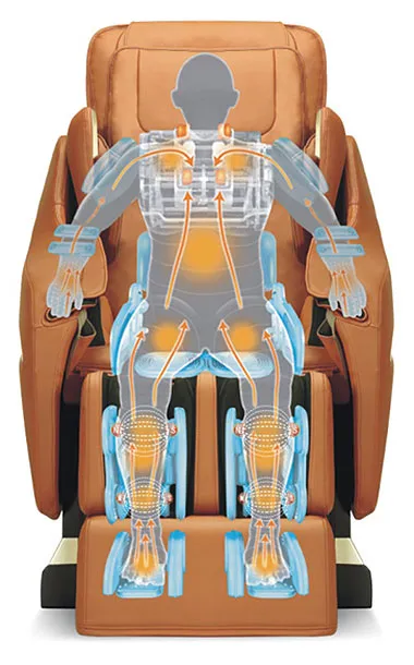 تاثیر مثبت اشعه‌ی مادون‌قرمز بر روی کاهش درد و بهبود سلامتی از نظر علمی اثبات شده است. برخی از صندلی‌های ماساژ با استفاده از پنل‌های گرمایشی فیبر کربن دمای ناحیه‌ی کمر را بین ۴۰ تا ۵۰ درجه بالا می‌برند. این قابلیت می‌تواند به رفع خستگی و گرفتگی عضلات کمک کند. پنل‌های فیبر کربن برخلاف پنل‌های سرامیکی قادر هستند اشعه‌ی مادون‌قرمز با طول‌موج بلند (Far-Infrared) تولید کنند. طول‌موج این ناحیه از اشعه‌ی مادون‌قرمز با بدن انسان هماهنگی دارد و به همین علت سلول‌ها می‌توانند این انرژی را جذب کنند. جذب انرژی سلول‌ها را فعال‌تر می‌کند و در نتیجه متابولیسم بدن انسان بهبود می‌یابد.