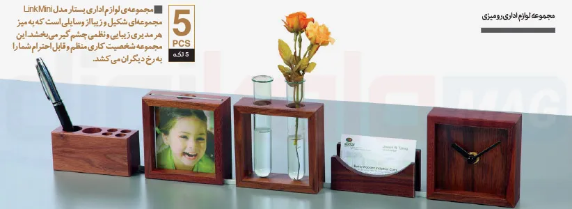 مرتب بودن میز کار باعث میشود تمرکز بیشتری هنگام کار کردن داشته باشیم. مجموعه لوازم اداری رومیزی بستار مدل Link Mini به میز کار و لوازم مورد استفادهتان نظم و ترتیب میدهد. Link Mini مجموعهی کاملی از جامدادی، جای کارت، گلدان، قاب عکس و ساعت است. قاب عکس چوبی این مجموعه میتواند جای عکس زیبایی از اعضای خانوادهتان باشد. خانوادهای که به شما قوت قلب میدهد تا در کارتان موفق باشید.