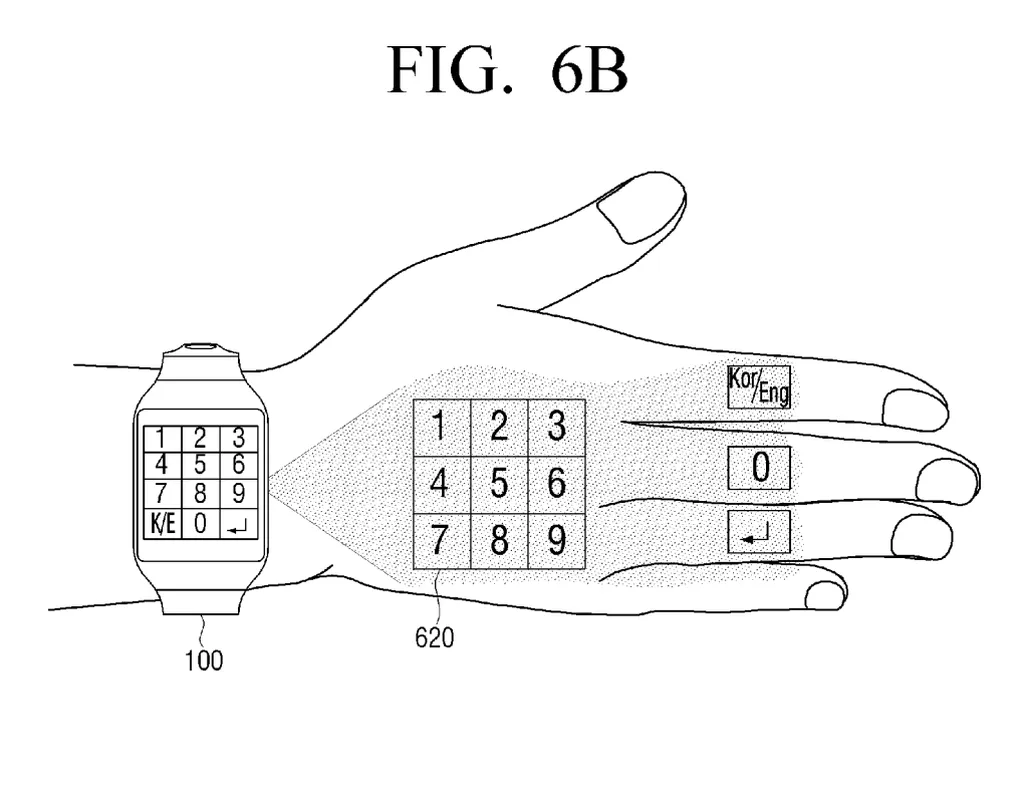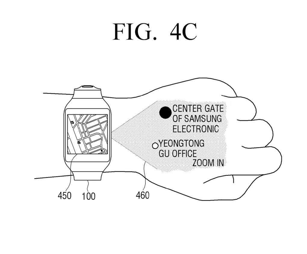 این تکنولوژی همان تکنولوژی نمایشگرهای بالای سر مثل هدستهای واقعیت مجازی (VR) یا واقعیت افزوده (AR) است، که میتواند تصویر را روی سطوح اطراف مثلا دیوار، بیفکند. همانطور که در عکس مشاهده میکنید، طرح اولیه این اختراع، ساعت هوشمندی را نشان میدهد که یک صفحه شمارهگیر (Dial Pad)، هشدار (Notifications)، گزینههای منو و همینطور روی پشت دست شخصی که آن را پوشیده یک صفحه با نوشته دارد. تصاویر کاربر را در حال تعامل با صفحهای که بیرون از ساعت هوشمند است، نشان میدهد.