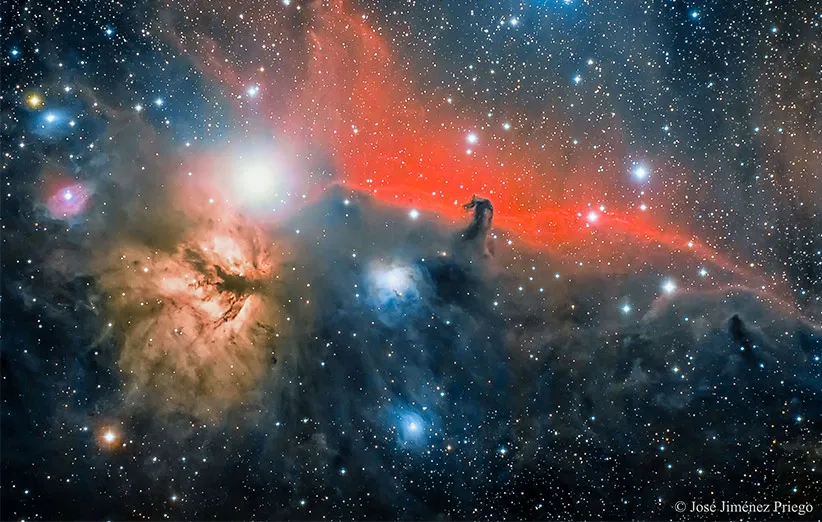 سحابی سر اسب، یکی از مشهورترین سحابیهای آسمان شب است. این سحابی را میتوانید مثل یک عارضهی ستونی شکل تاریک که وارد قسمتهای قرمز رنگ سحابی شده ببینید. سحابی سر اسب واقعا تاریک است چرا که ماهیت واقعی آن نیز ابری کدر از گرد و غبار است که جلوی نور سحابی نشری پشت خود را گرفته. درست مثل ابرهای موجود در جو زمین، ظاهر این ابر هم خیلی اتفاقی به این شکل در آمده و هزاران سال دیگر، قطعا ظاهر دیگری خواهد داشت. نور قرمز سحابی نشری بر اثر ملحق شدن الکترونهای آزاد با پروتونها برای تشکیل اتم هیدروژن بوجود میآید. در قسمت سمت چپ سحابی سر اسب، سحابی شعله دیده میشود. یک سحابی نارنجی رنگ که رگههایی از سحابیهای تاریک در آن دیده میشود. درست بین سحابی شعله و سحابی سر اسب، یک سحابی آبیرنگ بازتابی قرار دارد که نور ستارههای اطراف خود را منعکس میکند.